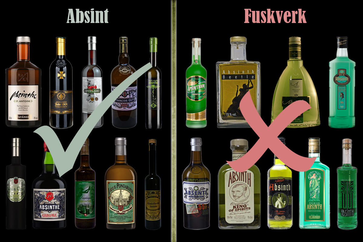 Det som skiljer en äkta och helt genuin absint ifrån andra så kallade fulabsinter (ofta kallade crapsinthes på engelska) eller så kallade bohemian style eller tjeckiska (se nedan under stycket Återkomsten) är att man när det gäller äkta absint kryddar stark finsprit (80 - 96%) med åtminstone de tre huvudingredienserna malört, anis och fänkål. Därefter ska denna kryddade anrättning destilleras. Detta är det abolut avgörande steget. När det gäller olika fuskvarianter så kryddas och filtreras de bara. I extremfallen används aromämnen (essenser) och i värsta fall till och med kemikalier både för smak och eventuell färg, men då handlar det sannerligen inte om någon absint längre. Olika fuskvarianter är dessutom betydligt billigare att producera men ändå säljs de väldigt ofta med ungefär samma prissättning som äkta vara. Ibland är de ännu dyrare. Lurendrejeri är helt enkelt vad det handlar om!