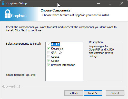 Det första man gör är att ladda ner och installera programsviten Gpg4win, i skrivande stund version 3.1.5. (Om du inte vill betala eller donera så klicka bara i $0.)