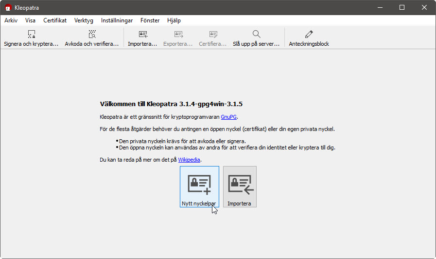 Okej. Då är det dags att börja tillämpa e-postkryptering och här beskriver jag processen med hjälp av Kleopatra (under Windows) i steg för steg. Jag skulle nog rekommendera att du följer anvisningarna på en större skärm eftersom bilderna blir lite väl plottriga på en mindre, t ex en mobilskärm.