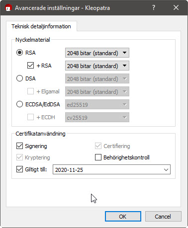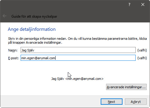 När installationen är färdig ska man skapa ett nyckelpar genom att klicka på knappen "Nytt nyckelpar" (som på bilden till vänster), alternativt skapa ett genom att välja samma i Arkiv-menyn. Då möts du av den här dialogrutan (bild 03) där du fyller i ditt namn och den e-postadress som du vill använda. Obervera att du ska fylla i ditt eget namn och den e-postadress du vill använda för att det ska fungera framöver. Om du klickar på Avancerade inställningar så kan du välja krypteringsalgoritm och om du vill att din nyckel ska användas för signering och när den ska gå ut (bild 04). Min rekommendation är att man använder de förvalda för 2048 bitars RSA-kryptering och att de ska användas för signering. Men om man vill så kan man klicka bort att nyckelparet bara ska vara giltigt en viss tid, vilket jag rekommenderar. Utgångsdatum kan dock vara bra om man ska publicera sin publika nyckel på någon nyckelserver.