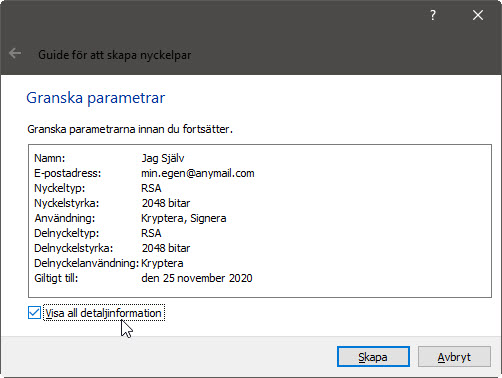 Nästa steg i guiden är att granska de parametrar man har valt (bild 05) och om det ser korrekt ut klicka på Skapa. Därefter ska du skriva in det lösenord som du vill använda. Kom ihåg att välja ett bra/starkt lösenord (alltså inte typ 1234 eller password, men det är ju upp till dig att avgöra) och att du inte ska glömma bort det valda lösenordet.