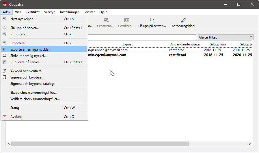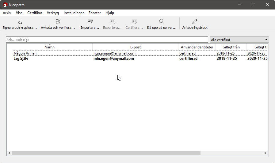 Du har nu en första uppsättning nycklar i programmet (bilden till vänster). Dina egna och någon annans.