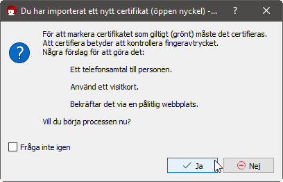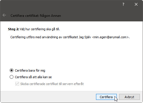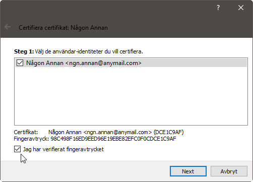 Säg nu att du ska skicka något (krypterat) till någon. Då behöver du först en fil med dennes publika nyckel. Denna sparar du och väljer sedan att importera i Kleopatra. Du får då en fråga om hur du vill certifiera den (bild 09). Detta innebär att du talar om för programmet att den nyckel du har laddat ner verkligen tillhör den person som säger sig ha tillverkat den. Särskilt viktigt är det när man ska kolla signaturer, alltså att meddelandet (eller något annat, ett program t ex) verkligen kommer från den man tror och att det inte har förvanskats någonstans på vägen så att säga. Du certifierar genom att kolla att det så kallade fingeravtrycket stämmer. Om du vet, eller anser dig veta, att det stämmer så glöm inte att markera checkrutan för "Jag har verifierat fingeravtrycket" (bild 10). I nästa steg (bild 11) rekommenderar jag att bara certifiera för dig själv... Just det här med att certifiera kan man så klart göra vid ett senare tillfälle.