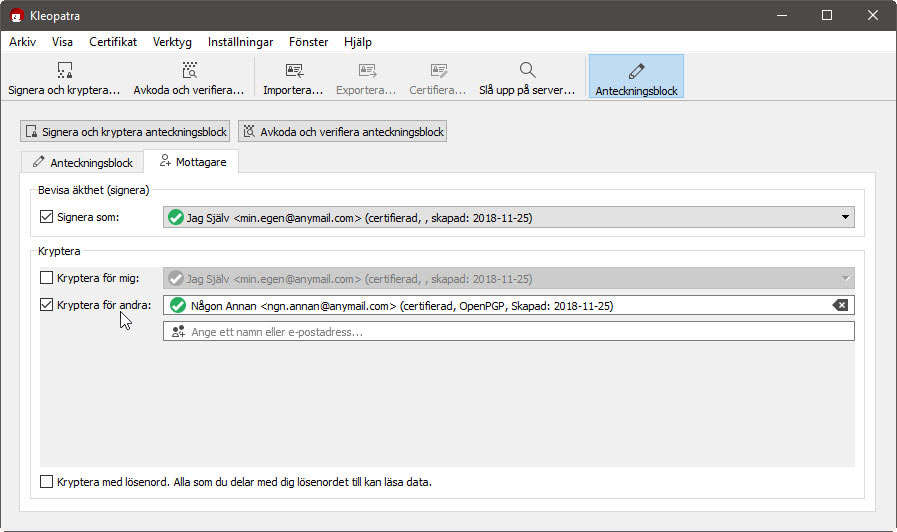 För att skicka ett krypterat meddelande bör du inte börja skriva i ditt e-postprogram eller på Gmail på webben. Risken finns då att du råkar skicka något okrypterat eller att t ex Google kan avläsa det du skriver innan det är krypterat. Istället ska du klicka på knappen Anteckningsblock. Därefter väljer du fliken Mottagare (bild 13) och kryssar för om du vill signera meddelandet och vem du ska skicka det till. Där kan det hända att man är tvungen att börja skriva och sedan klicka i det rätta valet så att fältet blir komplett ifyllt. (Ibland kan det vara bra att även kryptera det till sig själv så att du senare kan avkryptera det.. själv. I annat fall är det bara mottagaren som kan avkryptera och se innehållet.)