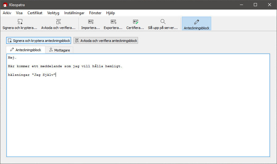 På den här sidan går jag igenom de absoluta grunderna i kryptering med hjälp av GPG i programmet Kleopatra som är en del av Gpg4win. Först dock lite om koncepten som är bra att känna till.