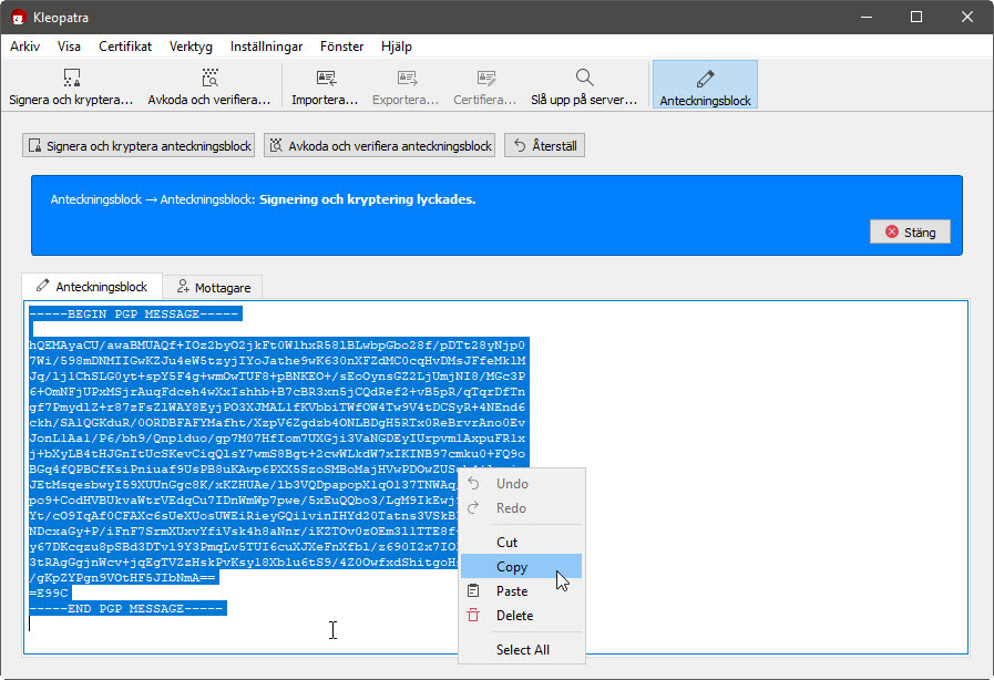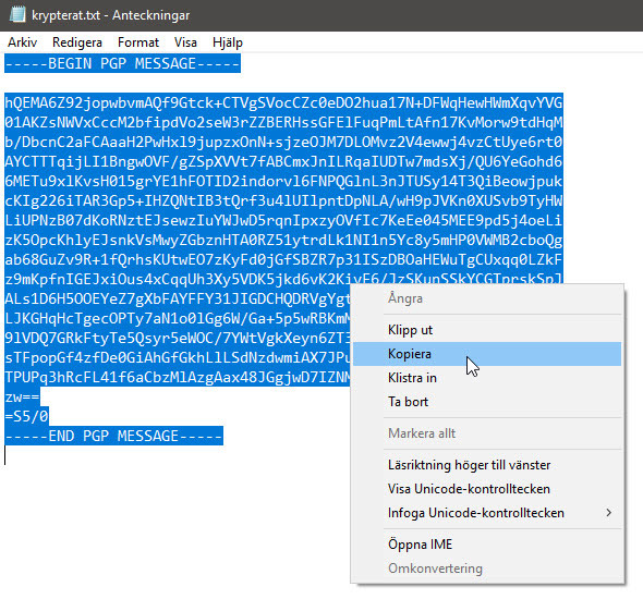 När du har skrivit klart så klickar du på knappen "Signera och kryptera anteckningsblock". Alltså inte knappen ovanför som bara heter "Signera och kryptera..." för den använder man istället när man ska kryptera t ex filer (bilder etc). Efter signering ombeds man dessutom att fylla i sitt lösenord för att veta att du som har skickat det är just du. Då omvandlas texten till krypterad sådan (bild 15), och det är denna som kopieras och sedan klistras in i meddelandefältet i ditt e-postprogram eller på webben. Observera att all text, alltså från och med "-----BEGIN PGP MESSAGE-----" till och med "-----END PGP MESSAGE-----", ska markeras och kopieras.