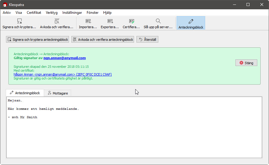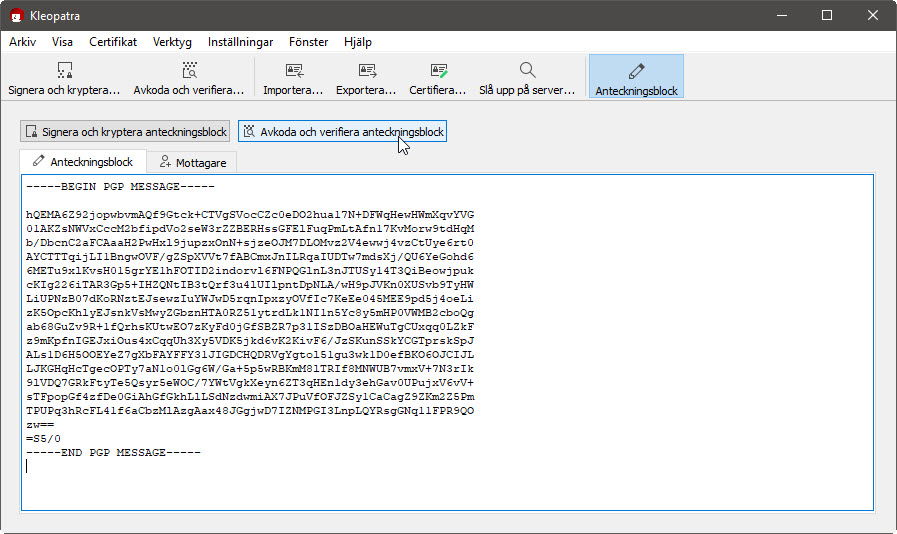 Motsvarande förfarande tillämpas om du får något PGP-krypterat skickat till dig. Då kopierar du den krypterade texten (i dess helhet, som ovan eller som bilden till vänster) och klistrar in den i Anteckningsblocket i Kleopatra. Därefter klickar du på "Avkoda och verifiera anteckningblock" (bild 17) varvid texten som av magi, och efter att du har fyllt i ditt lösenord, blir läsbar igen (bild 18).